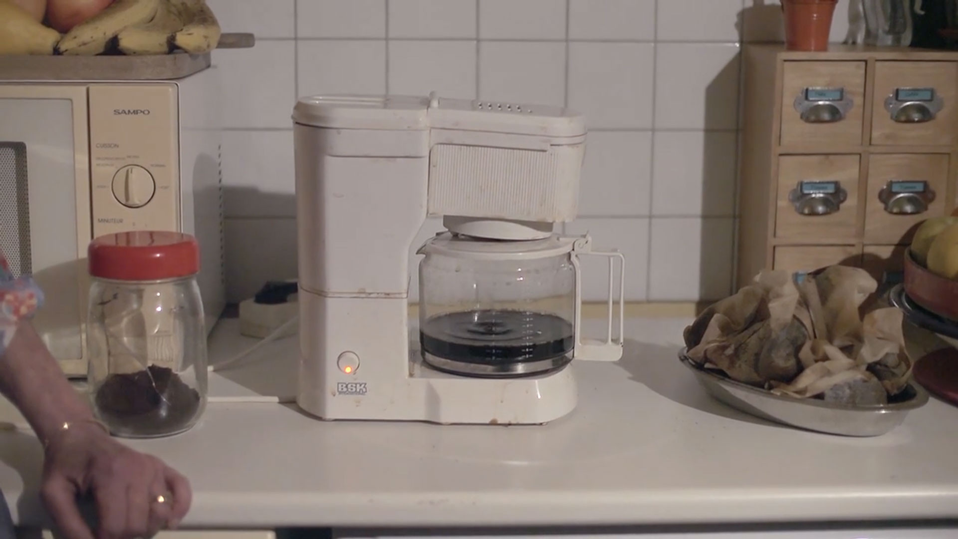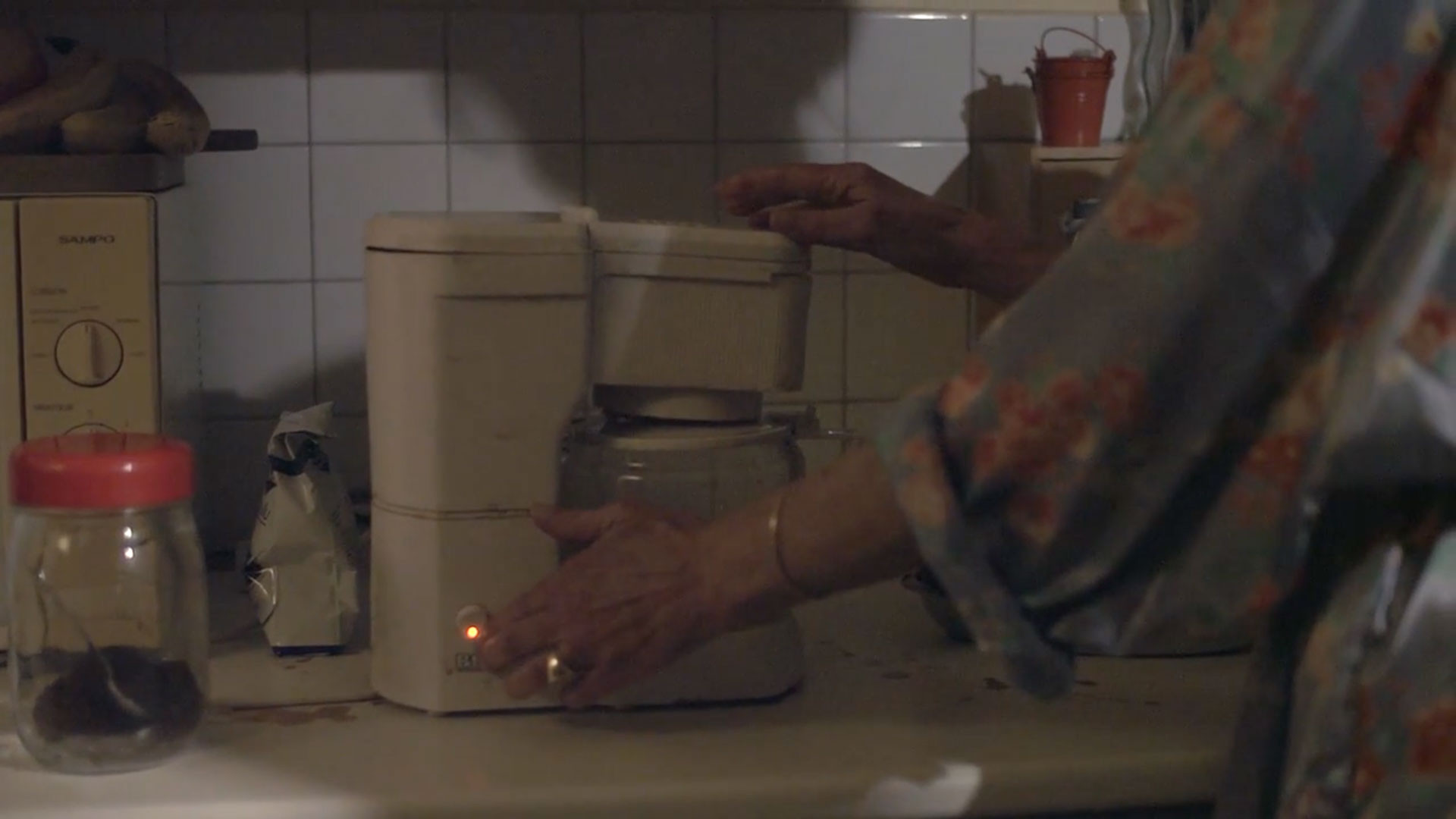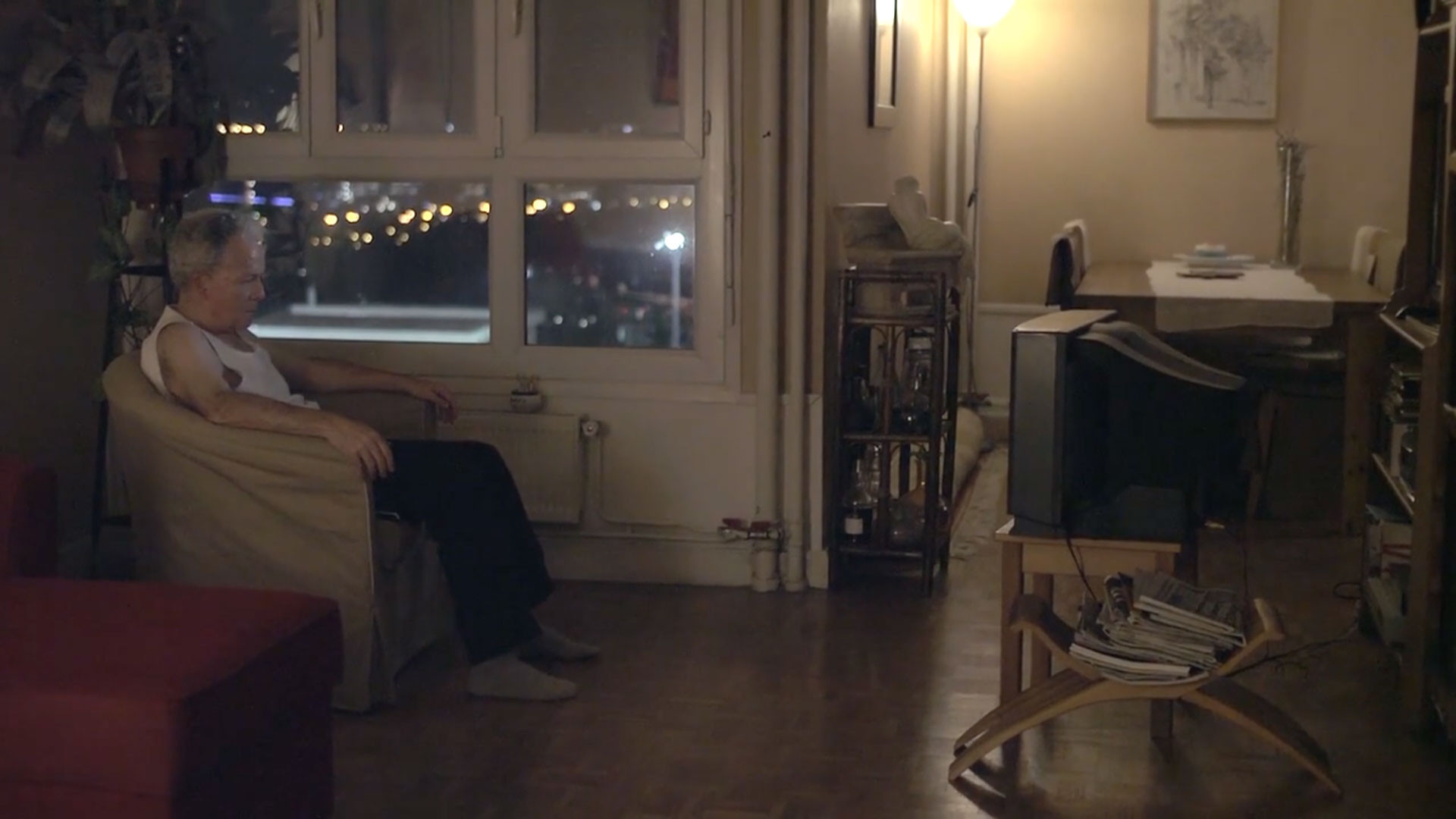 Dans Le café et la télévision, une femme et un homme impliqués dans un environnement domestique s’adonnent à des activités toutes prosaïques : tandis que l’une s’affaire à la cuisine, l’autre regarde la télévision, mais, dans le temps long de ces scènes a priori banales, surviennent quelques éléments perturbateurs puisque la cafetière ne termine jamais son cycle, interrompu par un geste absurde - le café qui a coulé servant à remplir le réservoir d’eau pour un prochain café, alors qu’au salon, pendant ce temps, le téléviseur omnipotent semble régir l’attention de l’individu.