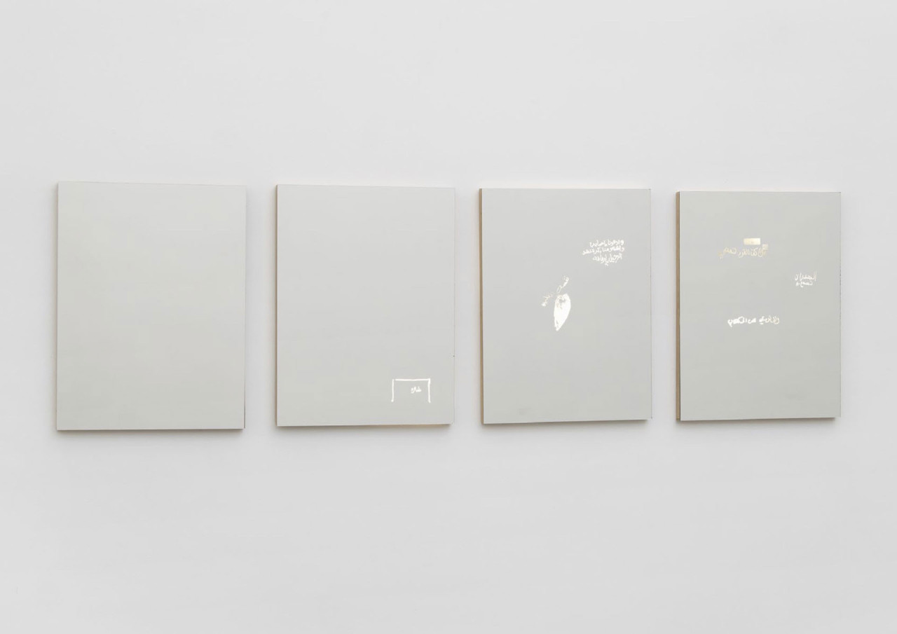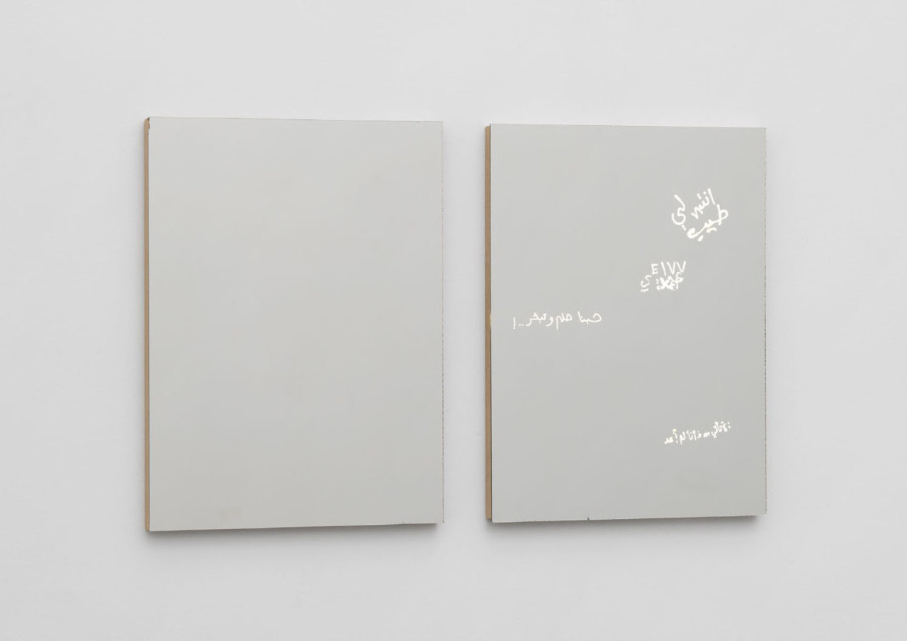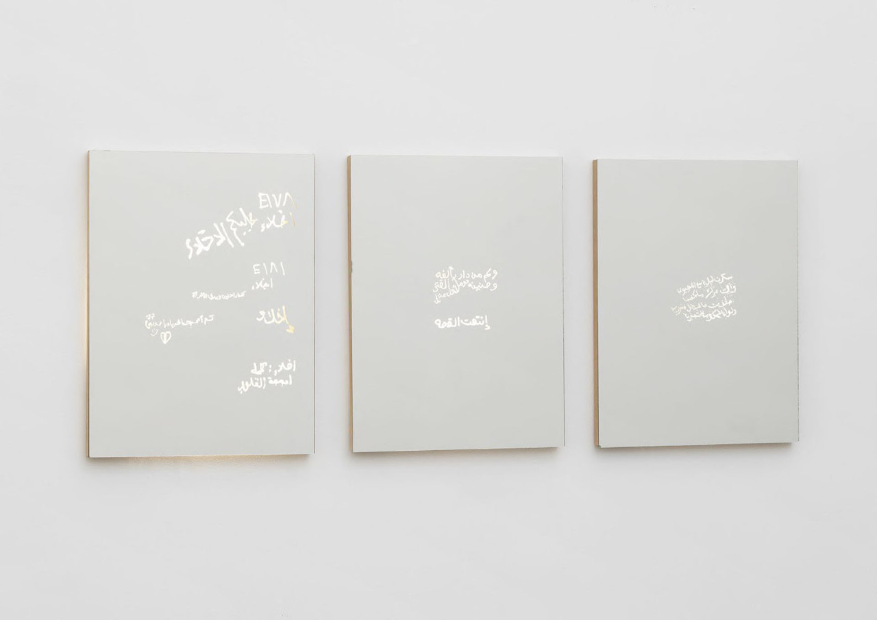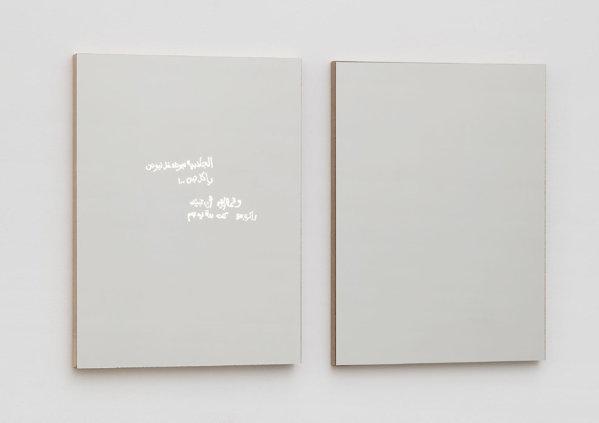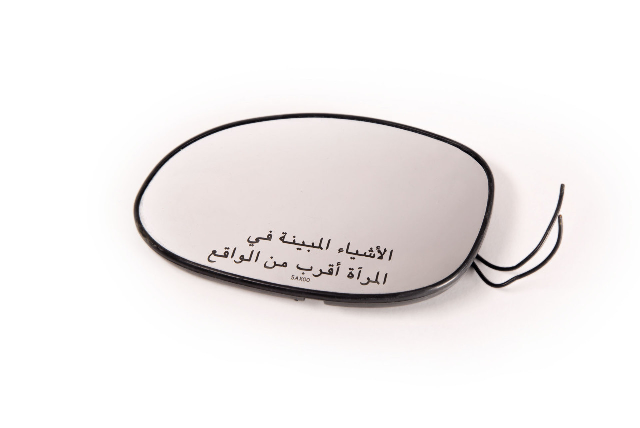 Alors que dans ce film de voiture, le rétroviseur agit comme un miroir grossissant où le réel déborde toujours, l’artiste propose une série de 11 miroirs gravés rétroéclairés qui se déplient dans l’espace à la manière d’un poème documentaire en cut-up. Ces artefacts qui ont été conçus avec la matière première servant à la réparation de rétroviseurs à Djeddah donnent à lire un ensemble de graffitis récoltés dans les rues pendant le tournage du film en 2021.