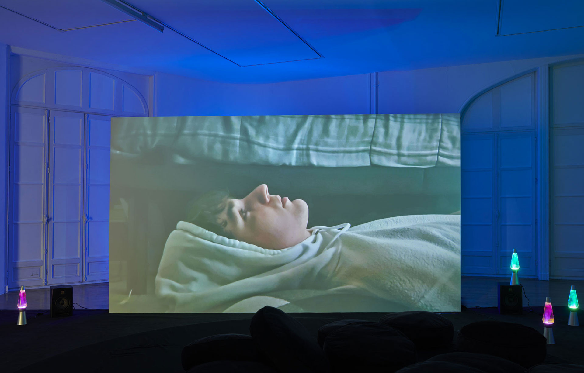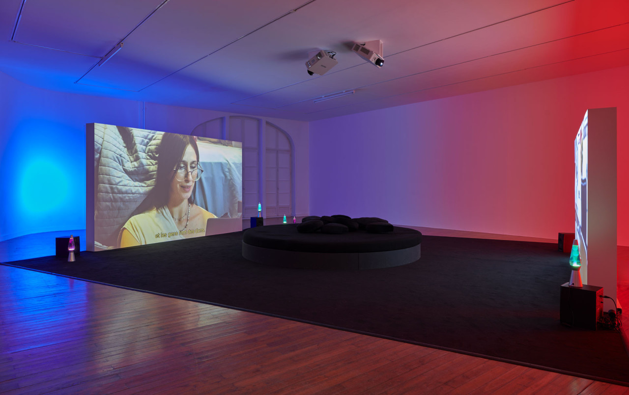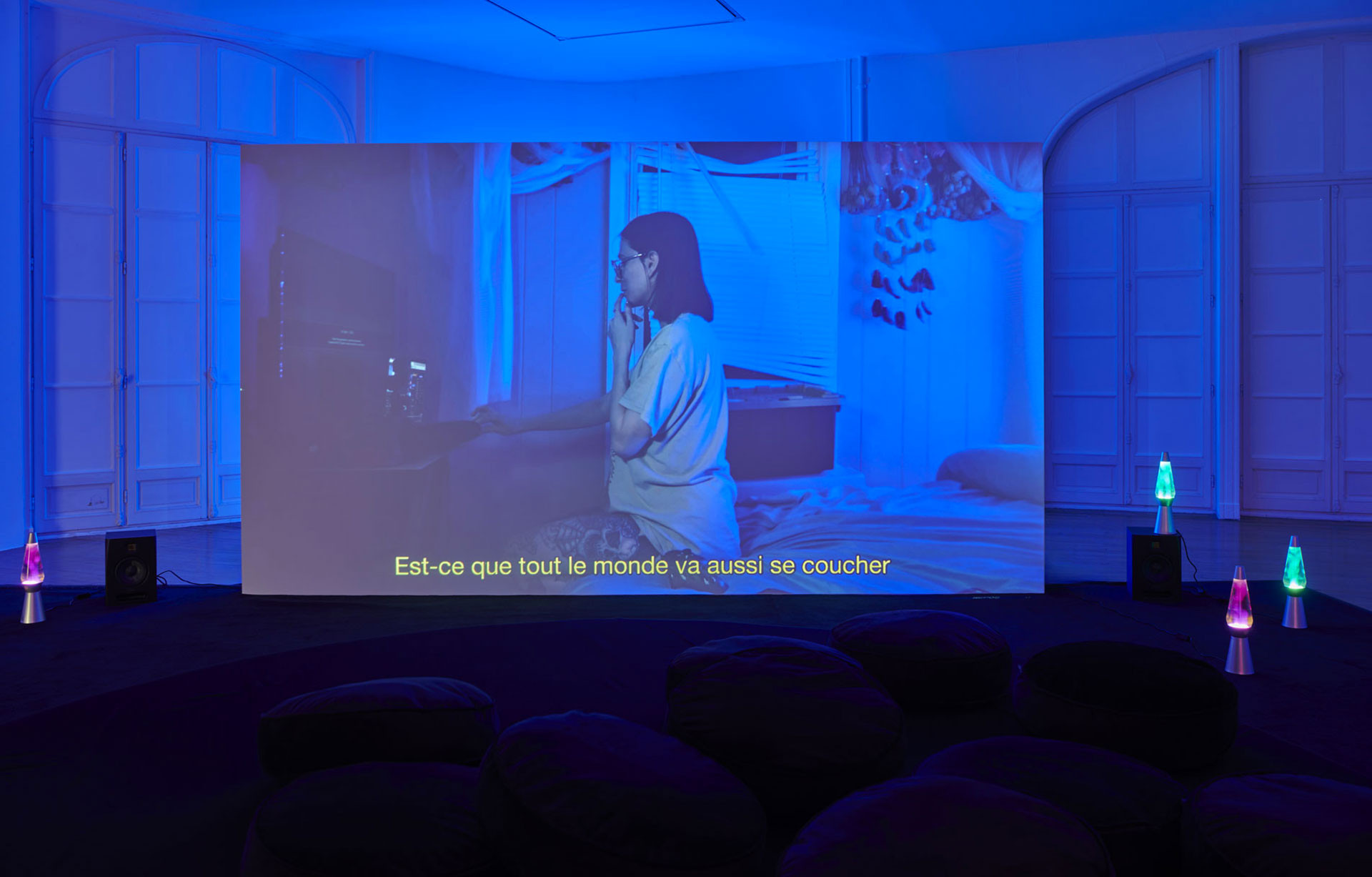 Je présente fréquemment mes films en installations filmiques qui mêlent différents types de projections. Ici, le montage « classique » du film qui donne à voir les moments de tournage chez trois streamers – Dottea, Andrew et Stephen – cède par moment la place à un montage « en direct » sur l’écran plus petit qui lui fait face. Cette pratique du sommeil perdure aujourd’hui et peu importe l’heure de connexion, des sleep streams sont toujours disponibles. J’ai voulu proposer une œuvre qui a ce rôle de veilleuse en donnant à voir ces lives présents sur les plateformes au moment T de l’exposition. Nous avons développé avec l’artiste numérique Léo Huet un dispositif qui réoriente ces lives en regard des rêves textuels affichés à l’écran, recadrés, zoomés en direct et intégrés au montage du film dans l’espace. Un dispositif lumineux : une lumière rouge-rose derrière le plus petit écran s’active lorsque le film passe en direct. Cette double temporalité permet à la fois de vivre une expérience du film très proche des arts vivants, comme si les spectateur·ices devenaient très proches des streamers, et elle permet également un autre rapport au temps, en se connectant à un tout autre fuseau horaire.