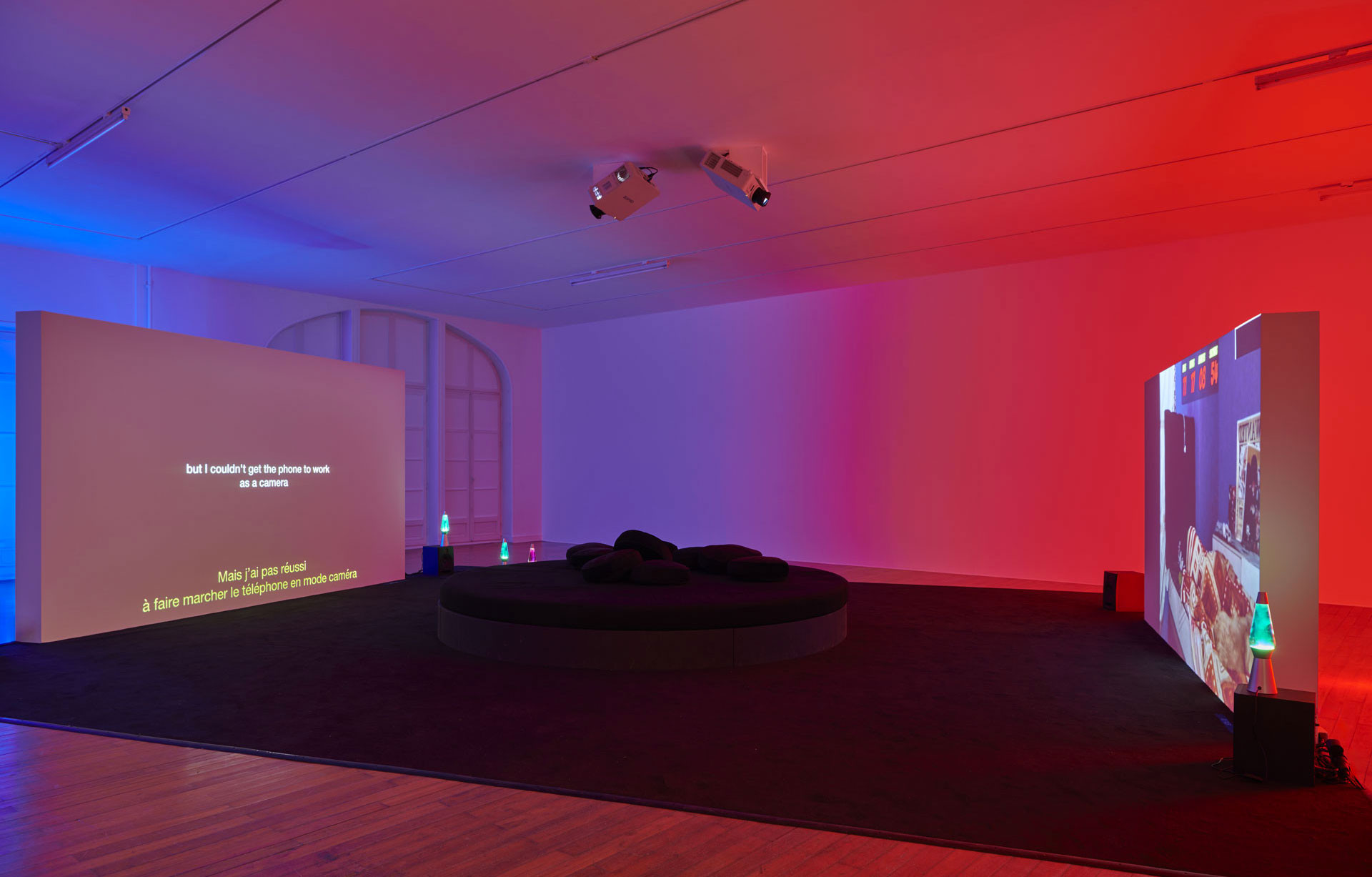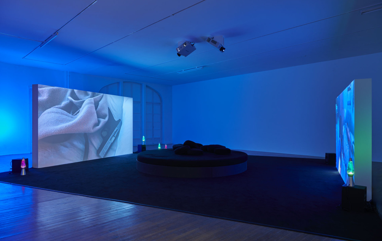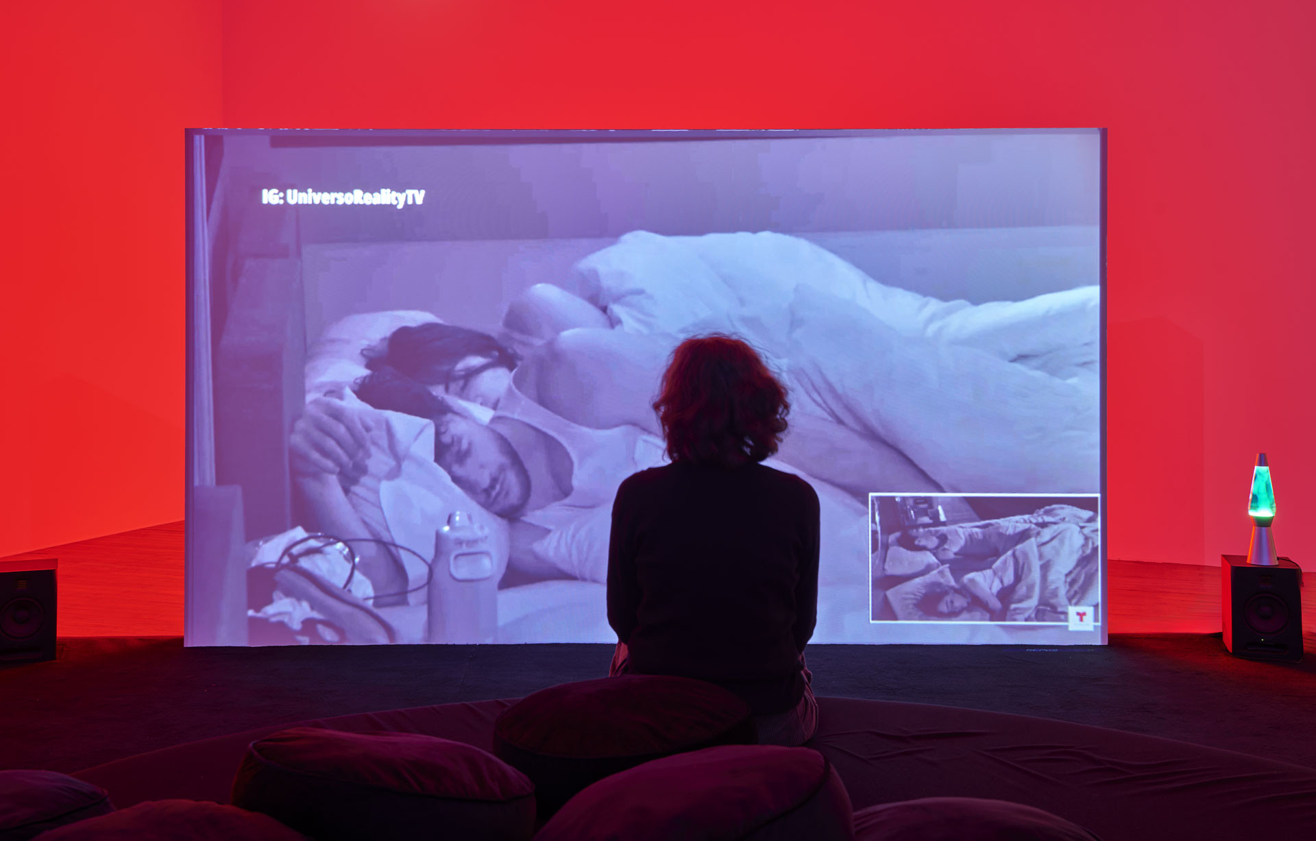 Je présente fréquemment mes films en installations filmiques qui mêlent différents types de projections. Ici, le montage « classique » du film qui donne à voir les moments de tournage chez trois streamers – Dottea, Andrew et Stephen – cède par moment la place à un montage « en direct » sur l’écran plus petit qui lui fait face. Cette pratique du sommeil perdure aujourd’hui et peu importe l’heure de connexion, des sleep streams sont toujours disponibles. J’ai voulu proposer une œuvre qui a ce rôle de veilleuse en donnant à voir ces lives présents sur les plateformes au moment T de l’exposition. Nous avons développé avec l’artiste numérique Léo Huet un dispositif qui réoriente ces lives en regard des rêves textuels affichés à l’écran, recadrés, zoomés en direct et intégrés au montage du film dans l’espace. Un dispositif lumineux : une lumière rouge-rose derrière le plus petit écran s’active lorsque le film passe en direct. Cette double temporalité permet à la fois de vivre une expérience du film très proche des arts vivants, comme si les spectateur·ices devenaient très proches des streamers, et elle permet également un autre rapport au temps, en se connectant à un tout autre fuseau horaire.