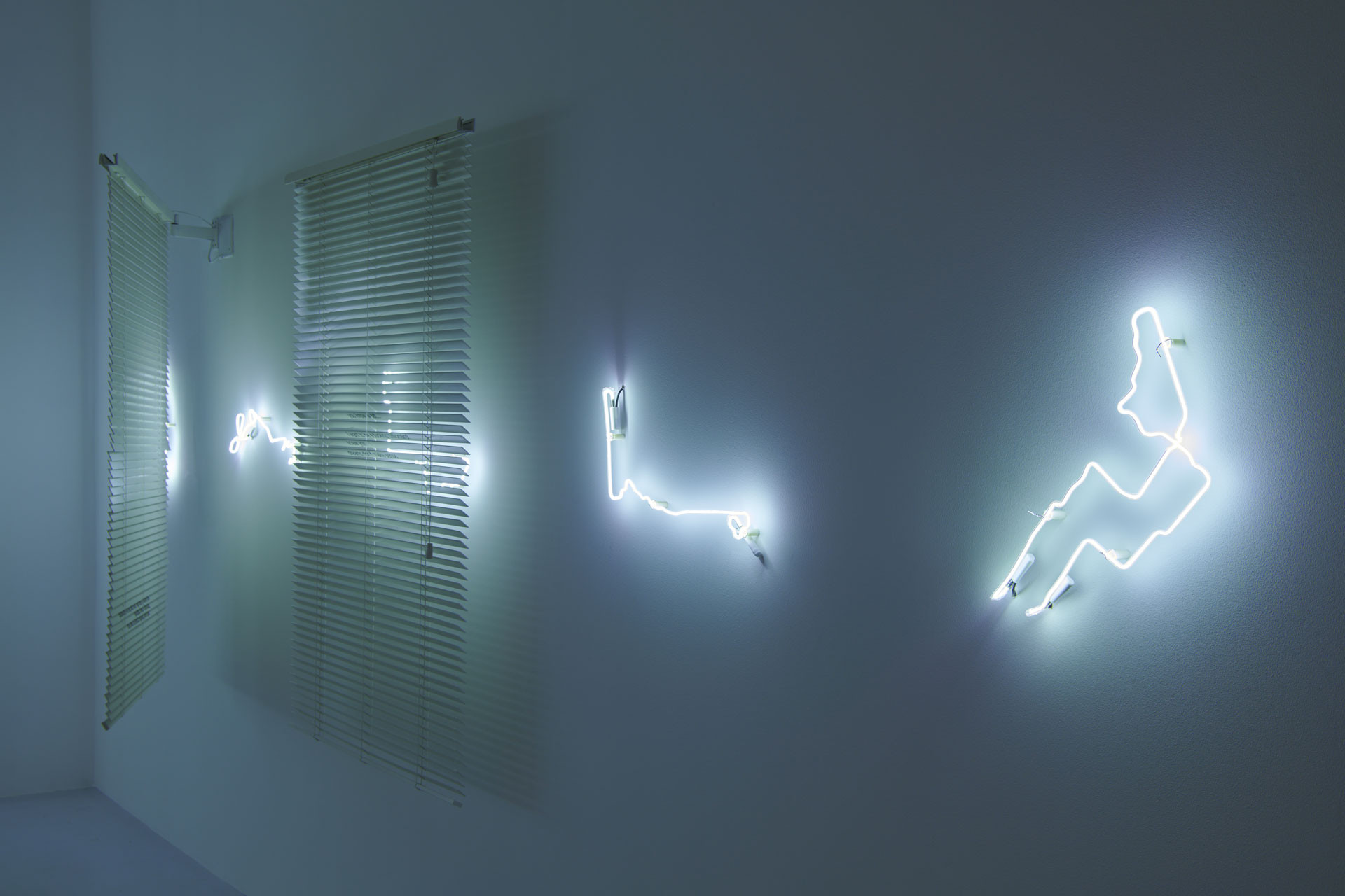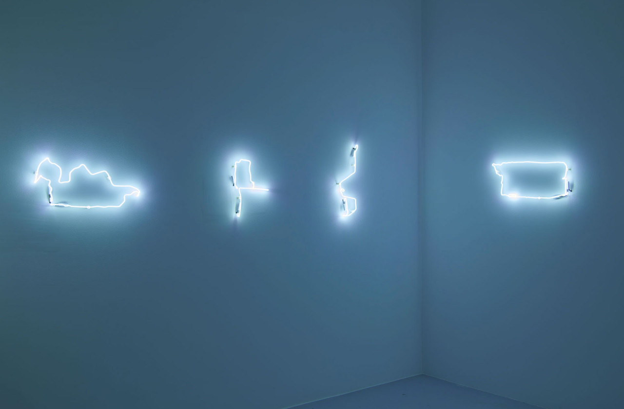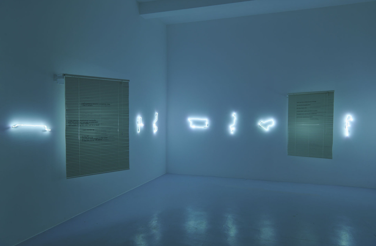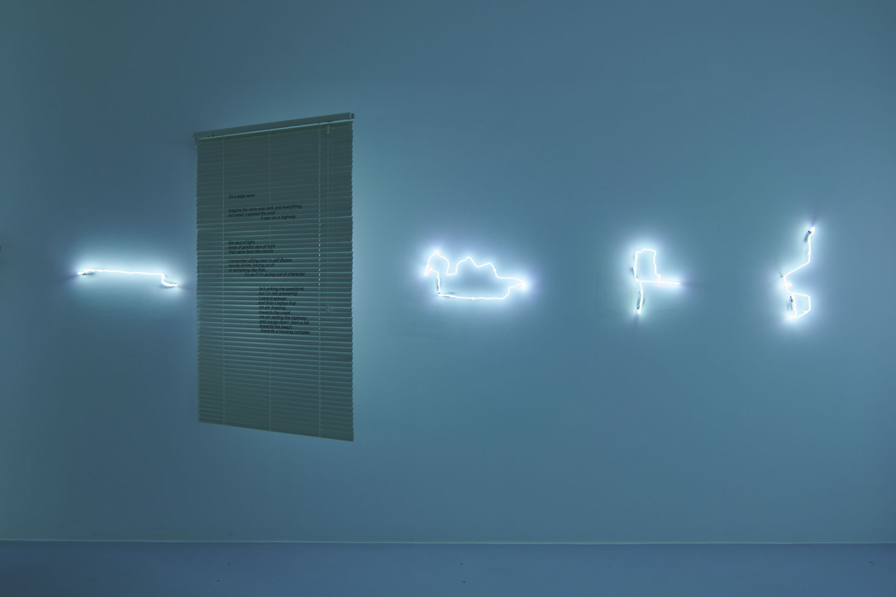 J’ai ensuite eu envie de mettre ces poèmes en mouvement au fil de la déambulation des spectateur·ices, de mes trajets GPS rêvés dessinés en néon, afin de créer de véritables séquences, entre apparition, disparition et dialogue. Ces séquences texte et lumière ne possèdent pas d’ordre de lecture entre elles. Elles font partie d’un script ouvert dans l’espace, faisant se joindre le film à ma pratique de la littérature expérimentale.