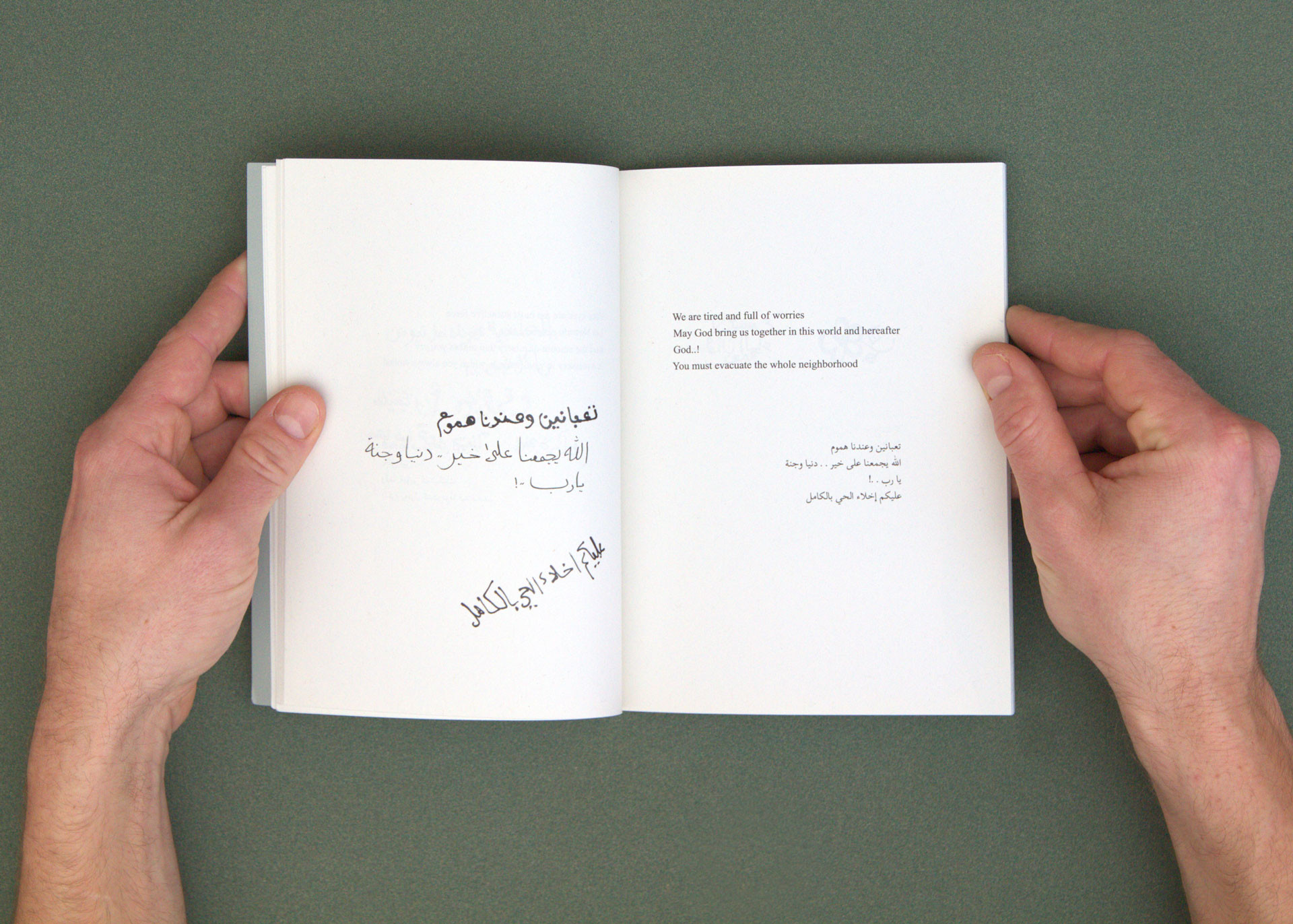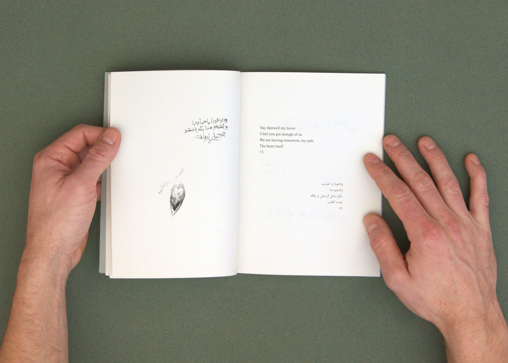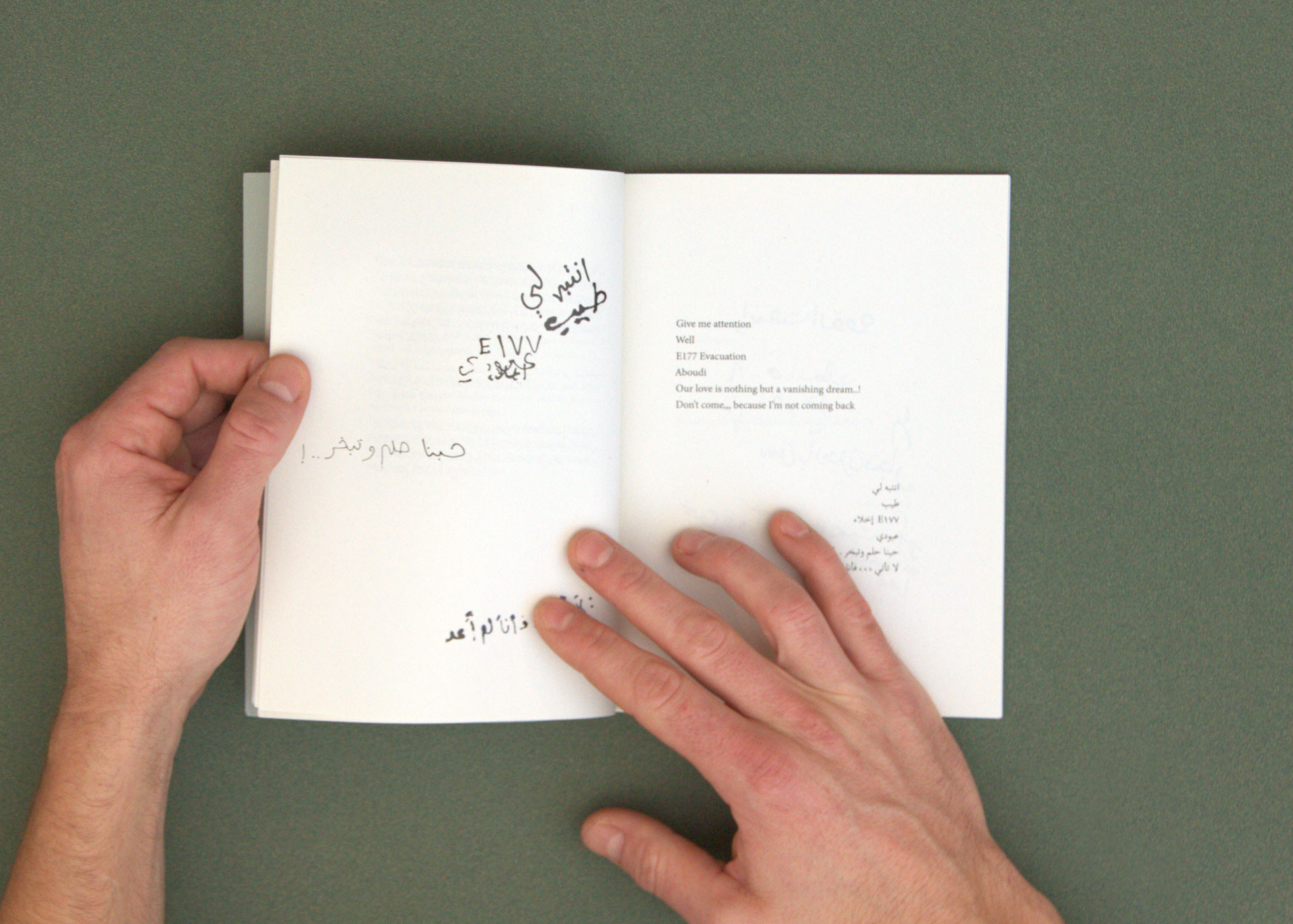 Chaque page de gauche montre ces graffitis dans leur forme brute, accompagnés de leur traduction en anglais et de leur transcription en arabe sur la page opposée. Le livret suivant contient divers fragments de photogrammétrie urbaine réalisés pendant cette même période à Djeddah et à Khaybar. Ces éléments 3D ont été utilisés pour composer la partie en image de synthèse du film.